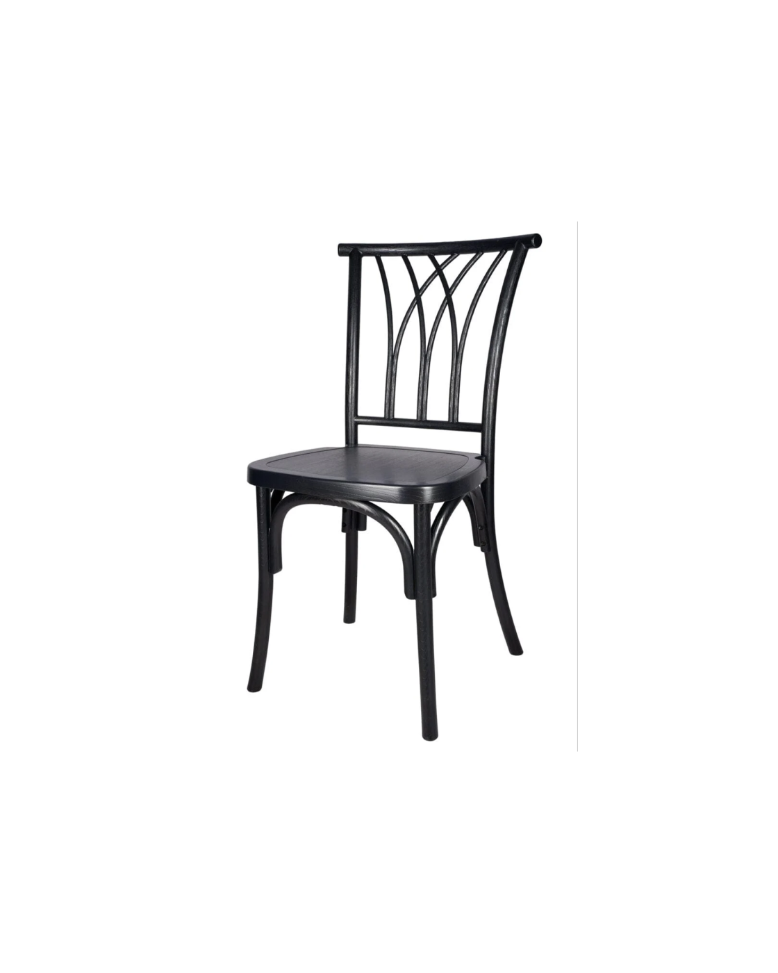 The Black Willow Chair features a striking arched back design with intersecting lancet arches, echoing the elegance of cathedral windows and Gothic architecture. Its dramatic silhouette makes it a standout choice for weddings, galas, and upscale events.